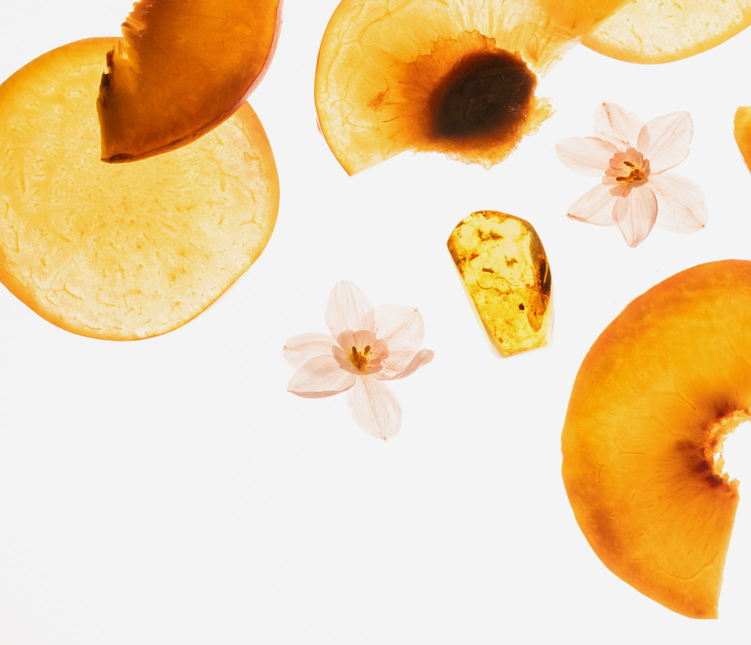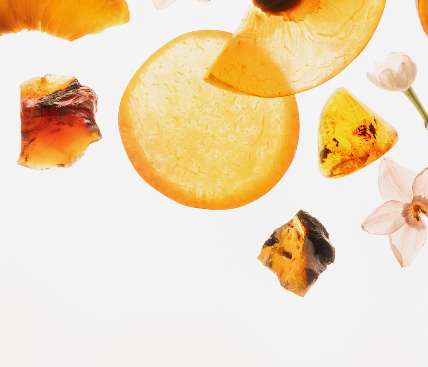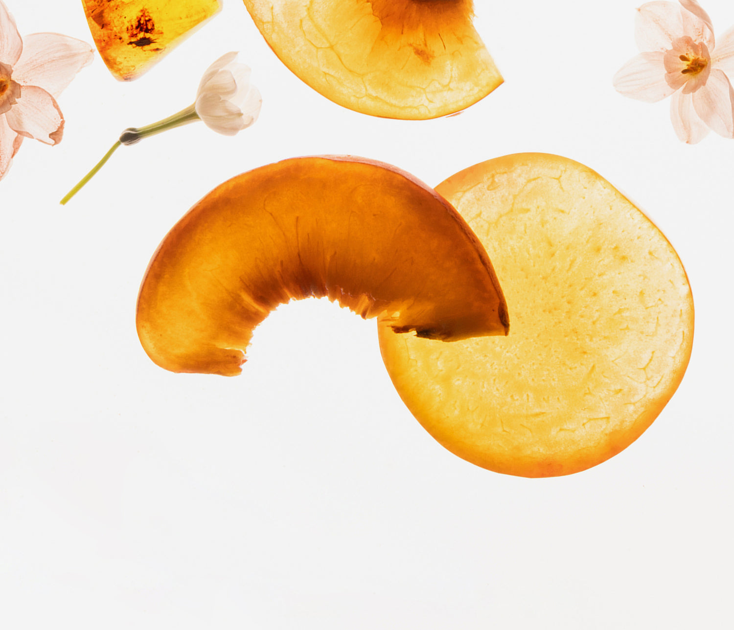 Velvety and radiant. Juicy peach and vibrant cherry blossoms blend with amber's warmth, wrapping you in a serene, golden glow.